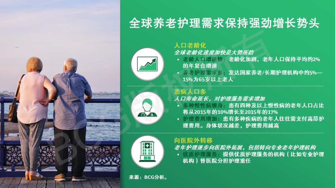 近年来,国际养老护理市场欣欣向荣。在全球人口老龄化、老年患病人口增多以及院外护理转移等核心因素的推动下,养老护理需求未来势必迎来高速发展。BCG从供需政策支持、老年疾病细分管理、专业康养、多元化养老模式及养老护理生态圈打造五个方向对标国际养老产业,基于核心洞察发现,为国内养老产业的健康管理建言献策。